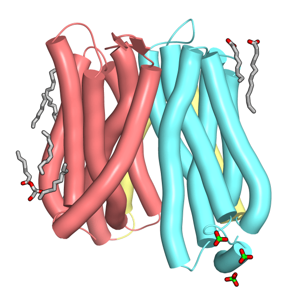 Transmembrane helices of POT (4IKV) shown with cartoon-cylinder model of different smoothness (2.0, 3.0, and 5.0 for left, center, right panels, respectively).