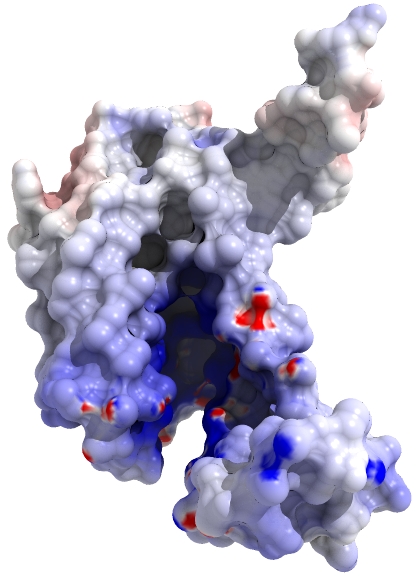 Surface model representations of B. halodurans YidC (3WO6) coloured according to its electrostatic potential