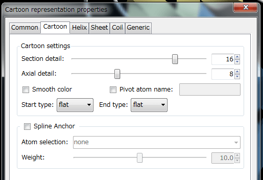 While the representation by the cartoon renderer is similar to that by the ribbon renderer, its helices, sheets, and coils are much more smooth than those of the ribbon renderer, capturing the features of the secondary structural elements in the protein fold. The following images show the examples of the cartoon with cylinder helix (left), cartoon with ribbon helix (middle), and ribbon (right) renderers with default parameters. Cartoon settings (Cartoon tab)In this tab, you can specify the cartoon settings common to the helix, sheet, and coil. Some settings are the same as those in the common settings in the ribbon renderer. Spline anchorHelix settings (Helix tab)Type of helix representation (helix_ribbon)In the cartoon renderer, helices can be displayed as