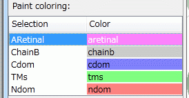 すると,下図のように,retinalがCPK modelで表示されます. 色の変更上記の操作でretinalをCPK表示することが出来ましたが, retinalの(炭素原子の)色が白色になってしまっています. これは,前Step2では蛋白質に相当する部分の着色は指定しましたが, A401番残基(retinalに相当)の色がまだ指定されていないためです. そこで次に,A401番残基retinalの色を指定します. Coloring panelで「3UG9-AB」を選択し,「+」ボタンを押して塗りを追加します. するとDialogが出てきますので,色をARetinalに,選択もARetinalにし,OKを押します. 以上の設定変更を行うと,下図のような表示になります. B鎖のretinalのCPKモデルを表示する前項のA鎖retinalの場合と同様にして,B鎖のretinalのCPK rendererを作成します. Sceneパネルで3UG9-ABを選択した状態で下方の「+」ボタンを押してrendererを追加します. Renderer option dialogでは,