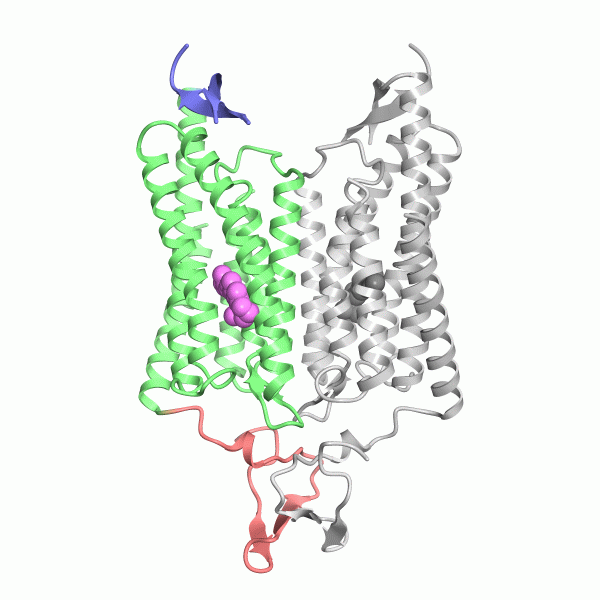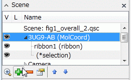 Step3: リガンドの表示と全体構造図の完成ChRには,リガンドとしてAll-trans retinalが結合していますが,本節ではこれを表示させ,図の完成とします. (厳密には共有結合でタンパクに結合しているのでリガンドとは違うかもしれませんが, 便宜上このように説明しています) 全体図ではリガンドは小さすぎて見えにくいため,CPK (空間充填) modelで表示することにします. リガンドの選択表示まず,retinalを選択する必要がありますが,それには何通りか方法があります. 以下それぞれ説明します. 構造モデルをクリックして選択する「構造モデルをクリックすることによる選択」は, 分子の構造中に目的とする分子や残基がどこにあるか, ある程度分かっている場合に便利です. まず,リボンモデルは分子中の主鎖しか表示されていないため,分子をクリックして選択するには不向きです.クリック用にsimple rendererを作成しましょう. まず,Sceneパネルで3UG9_AB.pdbをクリックして選択し,パネル下方の+ボタンを押すと,3UG9_AB.pdbへのrendererを追加するdialogが表示されます. そして,Rendererからsimpleを選び,Selectionはチェックを外しておき,OKを押します. すると,分子全体に対してsimple rendererの表示が追加されます. 現時点でsimple1の炭素原子の色はdefaultである$molcol(3UG9-AB object側の着色を参照)になっています. このままではsimple1 rendererの炭素原子の色が白っぽいため,背景の白色に溶け込んで非常に見づらくなってしまいます. そこで,Coloring panelでsimple1の炭素原子の色を黒っぽい灰色(#404040)に変更します(見易ければ何でもよいのでblackとかでもOK). 色の変更後は以下のような表示になります. 補足