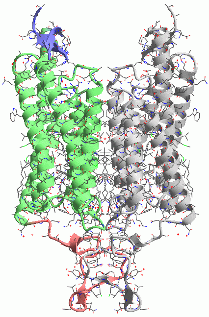 に変更しOKボタンをおします. この状態では,B Retinalの色がChainB (うすい灰色)になっています. この色を,前項で定義したBRetinal色(濃い灰色)に変更します. 前項同様に,まずColoring panelで「3UG9-AB」を選択し,「+」ボタンを押して塗りを追加します. するとDialogが出てきますので,色をBRetinalに,選択もBRetinalにし,OKを押します. 以上の操作を行うと,B鎖のretinalが下図のような表示にまります. リガンドが見やすいように,helixを細くする次に,ヘリックスのリボン表示にretinalが隠れてしまって見づらいので,リボンを細くします. まず,Sceneパネルのribbon1 (ribbon)という項目(蛋白質主鎖全体のリボン表示renderer)をダブルクリックします. すると設定ダイアログが表示されます. 次に,ダイアログ中にあるHelixタブをクリックし,Helixに関する設定を表示させます(上図は既にhelixタブが選択された状態). そして,Tuberの値を6→4に減少させます. OKボタンを押してdialogを閉じると,ヘリックスの表示が細くなります. さらに,Sceneパネルを操作しsimple1 rendererを非表示にし, さらにViewをタンパクの正面から見るように調整すると, 以下のような表示になります. ※Tuber値の意味