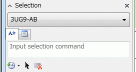 パネル下方の矢印ボタン また,MolStructパネルでは,単一残基だけでなく,複数残基を選択することも可能です. Selectionパネルから選択文を入力して選択する選択しようとする目的の残基やリガンドの, 残基名,残基番号などがあらかじめ分かっている場合は, Selectionパネルから選択文を入力して選択するのが便利です. (選択文自体は既にSTEP1,2で着色の指定などに使用しました) Selectionパネルを開き,タブ「 この状態で,"Input selection command"の部分に選択文を入力し, 下方の矢印ボタンを押すと,入力した選択文に対応する部分が選択されます. ChRのretinalはA鎖, B差ともに401番目の残基になっているので,選択文に A.401.* と入力し,矢印ボタンを押すとA鎖のretinalが選択されます. 選択文を使用すると,様々に複雑な方法で選択することが可能です. 選択文の詳細はcuemol2/SelSyntaxを参照してください. Styleへの登録Retinalに関する操作は今後よく行う可能性があるので,retinalの色と選択をstyleへ登録しておきます.