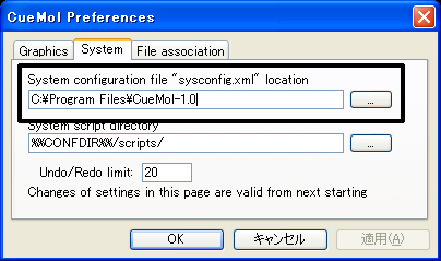 Windows版バイナリー配布からのinstallまず,Downloadのページからinstallerをdownloadしてください. Installerを実行する前に一般的な他のソフトウェアと同じように,インストーラーを実行すると インストールされます.前のバージョンが既にインストールされていると 問題なく上書きされるようですが,uninstallしてからinstallしたほうが 無難でしょう(コンパネ→プログラムの追加と...からuninstall出来ます). 注意: Installerの実行英語でいろいろ出てきますが,基本的にはウィザードのNextボタンを押していけばインストールは完了します. ActiveXのinstallVersion 1.1.0.108以降では,途中の画面でActiveXコントロールの インストールに関するオプションが増えています. Register the CueMol ActiveX Controlをチェックすると, 分子表示用ActiveXコントロールがインストールされます. はじめのインストールでインストールし忘れた場合でも, インストーラーをもう一度起動して,上記画面でチェックを入れた上で インストールすれば,後からActiveXコントロールをインストールすることが出来ます. Uninstallは,CueMolのuninstallと同時に,uninstallされます.ActiveXコントロールだけuninstallする方法は今のところ設けていませんが, ActiveXコントロールを兎も角も削除したい場合は, CueMolディレクトリにある,「CueMolCtl.ocx」を削除してください. 起動時のエラーについて (Version 1.0.0)普通にインストールすれば,だいたい普通に動くのですが, バージョン1.0.0ではいくつかの条件で,ちゃんと動かなかったりします. 例えば,Administratorでインストールして権限の低いuserで動かすと 起動時に以下のようなエラーが出ます. この状態でOKして起動すると, メッセージのとおり,"sysconfig.xml"という設定ファイルが正しく 読まれていないため,ちゃんとモジュール等が ロードされていない状態で上がってしまい,機能がまったく使えません. "sysconfig.xml"はCueMolがinstallされているdirectoryにあるはずなので メニュー”Edit→Preferences...”で環境設定のdialogを出し,Systemタブ にある"System configuration file location"に正しいdirectory名を 入れてやって,CueMolを再起動すればOKのはずです. Version 1.1.0以降では,adminより低い権限のユーザーでも, そのユーザーが書き込めるフォルダーにインストールすれば, 問題なく動くようになりました. Sourceからのinstall