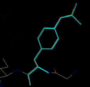 となっていますが,実際に重要なのは RESIdue ALA ... ENDというのと, ATOM, BONDのところだけです.*2 {}内と先頭に!のある行はコメントになります. さらに,残基のプロパティーが最後のほうで定義されています.(これはCueMolでの勝手な拡張ですが.) !------------------------------------------------------------------ ! Que's extension commands PropResid ALA Pivot CA END ... これで,traceやtubeレンダラーで 原子CAが既定の主鎖原子として扱われるようになります. 逆に,この記述がなければtraceなどでその部分が切れて表示されてしまいます. あと,大文字・小文字は同じとしてあつかわれます.RESIdueもresidueも同じ. 燐酸化チロシンを作ってみる例として燐酸化チロシンを作ってみます. 燐酸化チロシンは,PDBでの残基名はPTRのようなので,それにあわせます. PropResidセクションの作成まずPropResidセクションを作成します. 主鎖原子などはTYRと同じなので, queptl.top内のPropResid TYRの部分をコピーして, 残基名をPTRに変えるだけでOKです. PropResid PTR Pivot CA Ring CG CD1 CE1 CZ CE2 CD2 END END Ringの部分は環状構造の原子を指定していますが, これも変わらないのでそのままでOKです. 以上でtraceやtubeでPTRがアミノ酸残基として認識され, 連続して描画されるようになります. さらに,simpleなど原子レベルでの表示でも正しく共有結合が 描画されるようにするためには,以下のステップが必要です. Residセクションの作成次に, queptl.top内のRESIdue TYRの部分をコピーして,ATOM, BOND定義のみを残した上で 残基名をPTRにします. さらに,ATOMに関しては水酸基の水素原子HHの定義を除き, 変わりに燐酸基P, O1P, O2P, O3Pの定義を入れます. ここで,chargeは(1.0.0系の実装では)使われていないので, 適当な数値を入れてください. typeも厳密には使われてないのですが, 定義されていないatom typeを指定するとエラーになるので, 他の行で使われているのを適当に真似して入れておけばOKです(以下の例ではHHのをそのままコピーしています). 次に,BONDに関しては,先端の水酸基の水素HHを取って, 燐酸基P, O1P, O2P, O3Pに関する結合を追加します. RESIdue PTR ATOM N TYPE=NH1 CHARge=-0.35 END ATOM H TYPE=H CHARge= 0.25 END ATOM CA TYPE=CH1E CHARge= 0.10 END ATOM CB TYPE=CH2E CHARge= 0.00 END ATOM CG TYPE=CY CHARge= 0.00 END ATOM CD1 TYPE=CR1E CHARge= 0.00 END ATOM CE1 TYPE=CR1E CHARge= 0.00 END ATOM CD2 TYPE=CR1E CHARge= 0.00 END ATOM CE2 TYPE=CR1E CHARge= 0.00 END ATOM CZ TYPE=CY2 CHARge= 0.25 END ATOM OH TYPE=OH1 CHARge=-0.65 END ATOM P TYPE=H CHARge= 0.40 END ATOM O1P TYPE=H CHARge= 0.40 END ATOM O2P TYPE=H CHARge= 0.40 END ATOM O3P TYPE=H CHARge= 0.40 END ATOM C TYPE=C CHARge= 0.55 END ATOM O TYPE=O CHARge=-0.55 END BOND N CA BOND CA C BOND C O BOND N H BOND CA CB BOND CB CG BOND CG CD1 BOND CG CD2 BOND CD1 CE1 BOND CD2 CE2 BOND CE1 CZ BOND CE2 CZ BOND CZ OH BOND OH P BOND P O1P BOND P O2P BOND P O3P END 追加する位置はどこでも良いですが,アミノ酸の最後(バリン)のあとにしておきます. これでCueMolを再起動すると燐酸化チロシンPTRが認識されます. 1BF5など,PTRがあるPDBファイルを読み込んで見てください. この時点では残基は認識されているものの,ペプチド結合しうるというのが 認識できていないので,隣の残基との結合は表示されません. 残基間のリンケージ(queptl.lin)を編集残基間のリンケージ情報はqueptl.linファイルで定義されています. link pept head - ala tail + * end ... link pept head - val tail + * end linkのある行が残基間のリンクの定義です. 次のpeptというのはペプチド結合を示しています*3. (ホスホジエステル結合はnuc) 一番上の行は大雑把に言うと,「前(head)がalaで後(tail)が*(任意の残基)の場合はペプチド結合でつなげ」ということです.プラスとマイナスも意味があるのですが,ここでは省略. 残基PTRをペプチド結合する残基と認識させるには, link pept head - ptr tail + * end という行を追加してやればよいわけです. 上記の行を追加して,CueMolを再起動して1BF5のN末端をsimpleで表示すれば 正しく認識されているのが分かります. 注意点topやlinファイルを変更した状態で新しいバージョンのCueMolを 上書きインストールすると, パッケージ付属のデフォルトのファイルに上書きされてしまいます. バックアップを忘れずに. また,QScriptを使用する場合は, スクリプトから指定したファイルをトポロジー・リンケージ定義ファイルとして 読み込ませることができます(後述). システムディレクトリのqueptl.top等を変更するのではなく, 独自の残基定義を記述したファイルをスクリプトと同じ ディレクトリ等に作成しておき, それをスクリプト中から読み込むようにした方が良いでしょう. ネット上のリソースの利用ここで紹介したホスホチロシンと同じ方法で原理的にどんな化合物にも対応できるわけですが, 手動でトポロジーを作るのは結構面倒です. CueMolのトポロジー定義はCNS/XPLORと同じですので, ネット上にあるCNS/XPLOR用のツールを使って作る方法があります. PRODRG server は,PDB形式の座標を入力すると CNS/XPLOR用のパラメータ・トポロジーファイルを作ってくれます. このトポロジーのところをコピーしてやればよいわけです. この場合,上記でやったようにBOND以外の部分は