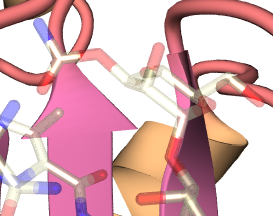 通常の出力では色の定義が0〜5まで分かれていましたが, ここではテキスチャの定義として分かれています. すなわち_blm_ab_p_tex0〜5を変更することで シート・へリックス・コイル部分のテキスチャを独立に設定できるわけです. また,incファイル内でpigmentの上書きを行っていないので, 木や大理石等のテキスチャが正しく反映されるという利点もあります. ここでは,_blm_ab_p_tex3〜5を以下のように書き換えてレンダリングします. #declare _blm_ab_p_tex3 = texture{ T_Chrome_4D };