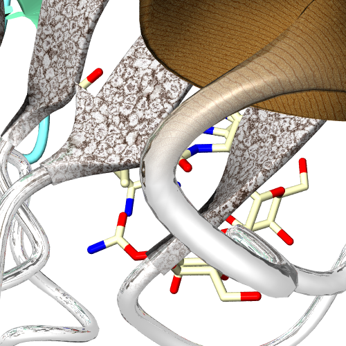 これでレンダリングすれば以下のように全部きちんと半透明になります. ただし,merge文を使用すると交差の計算のためレンダリングが遅くなるので 注意が必要です. テキスチャのブレンド以上で述べた方法により,色と半透明のグラジエント/ブレンド が自由に出来ることがわかったと思います. リボンモデルの二次構造の境界の色などで,滑らかに色が変化している部分で 色のブレンドが使用されています. ここではさらに,テキスチャのブレンドを行う方法を説明します. 例えばリボンの部分は木のテキスチャ,コイルの部分は金属光沢, という風なレンダリングができるようになります*2. まずテキスチャのブレンドを行うには, シーンのpov/incファイルへの書き出しの時点で, "texblend"というオプションを指定する必要があります. GUIからこのオプション設定は出来ないので,以下のスクリプト gfx.writeScene("<出力したいファイル名>", "pov", {texblend=>true});
