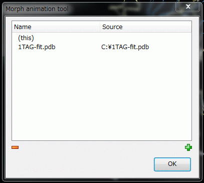 前準備ここでは,transducin-alphaのGTP bound form (1TND) とGDP bound form (1TAG) 間の構造変化を例に説明します. この2つの構造は分子としてはほとんど同じですが,各々PDBファイルに含まれる分子の位置が違ってしまっているため, まず両者を重ね合わせたPDBファイルを作成する必要があります. この例では,1TAGを1TNDに重ね合わせることとします. ファイルの読み込みと重ね合わせまず,1TAG, 1TND両者のファイルを読み込みます.PDBのサイトからダウンロード後「Open File...」から読み込んでも良いですし,「Get PDB using accession code...」を使用して直接PDBのサイトから読み込んでも構いません.(Documents/GUIのチュートリアル(CueMol2)/Step1参照) 1TAGは1つのchain(A)のみですが,1TNDは3つのchain (A,B,C)を含んでいます.1TAGは分子全体を,1TNDはchain Aに対してのみtrace rendererで表示させます. 次に,cuemol2/MolSuperposeの「Secondary Structure Matching」に従って,2つの分子を重ね合わせます. 1TAGをmovingに,1TNDをreferenceに設定し,1TNDのselectionに「c;A」を指定して, 重ね合わせを実行すると以下の図のようになります. 以上が完了したら,動かした方の1TAGをPDBファイルとして保存しておきます.メニュー「File」→「Save File As...」を実行し,1TAGを選択してOKを押し,その後表示されるファイル選択dialogでfile nameを1TAG-fit.pdbとして保存します. MorphMol objectの作成変化の始点となる構造の読み込みまず,変化の始点となる構造を読み込みます. ここでは,すでに読み込まれている1TNDを変化の始点としますので特に操作は必要ありませんが, ディスク上にあるPDBファイルなどを始点とする場合は,先に読み込んでおきます. MolCoordからMolMorph objectへの変換Morphingを行うには,まず,PDBファイルを読み込んで作成されるMolCoord objectを, 線形補間morphingに対応したMolMorph objectに変換する必要があります. メニュー「Tools」→「Mol morhping animation...」を実行すると,以下のようなdialogが表示されますので,MolMorphに変換したいMolCoord objectを選択します. この例では,1TAGと1TNDがリストに表示されていますが,始点の構造の1TNDを選択し,OKボタンを押します. 以上の通り実行すると,以下のようなdialogが表示されます. MolMorph objectへの構造座標の追加以上の操作で,1TNDがMolMorph objectへ変換されました. 上記のdialogでは,MolMorph objectが保持している座標データの一覧が表示されています. 現在1つの座標データから変換して作成した直後なので,項目は1つ(this)しかありません. 次に,構造変化の終点に対応する座標1TAG-fitを追加します. 上記のdialogの「+」ボタンを押すと,ファイル選択dialogが表示されますので, 上記で重ね合わせ後保存しておいた,1TAG-fit.pdbを指定し読み込ませます. すると,以下のように終点に対応する座標の項目が追加されます. 終点の追加が完了したら,OKボタンを押してdialogを閉じます. MorphMol objectの編集MorphMol objectに保持されている座標データの編集をさらに行う場合は, メニュー「Tools」→「Mol morhping animation...」を実行すると,再び上記と同様のdialogが表示されます. さらに座標を追加する場合は「+」を,不要な座標を削除する場合は項目を選択して「−」ボタンを押せば削除することが出来ます. アニメーションの作成アニメーションの追加以上でmorphingを行う準備ができました. 次は実際にどのタイミングでどの程度の時間をかけてmorphingを行うかを,Animation panelから指定します. 上図のAnimation panelの「+」ボタンを押し,「Mol Morphing」を選択すると, 以下のような設定dialogが表示されます. この例では,0秒から1秒かけて始点から終点へと変形させるアニメーションを作成します. まずStart timeが0:0:0.0に,Durationが0:0:1.0になっていることを確認し, Target MorphMolの項目で,上記で変換・作成した1TNDを選択します. MolAnim settingsにある他の設定項目の意味は以下の通りになります.