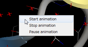 となっています. シーンにアニメーション設定がない場合QSCファイル中にアニメーションの設定がない場合,あるいはPDBファイルを読み込んだ場合等は, 画面を中心に垂直軸方向に10秒で360度回転するアニメーションが自動的に作成されます. 上記のように右クリックでメニューを出し, 単にゆっくり回転するアニメーションを表示させることが可能です. その他もろもろPDBファイルの表示上記のSourceプロパティーにはqsc以外にpdbファイルも指定できますが, simple表示以外で表示することはできません. 複雑な表示が必要なときはqscファイルを作ってそちらを読み込ませるようにしてください. ラベル表示とフォントの設定現バージョンでは,原子ラベルなど文字が含まれる表示が正しく表示されません. 今後修正していく予定です. QSLファイルの表示2.0.1.188以降のバージョンでは,Light-weight sceneの表示にも対応しています. Light-weight scene については,Light-weight scene についてをご覧ください. プレゼンで使うときはrendererの編集などは基本やらないでしょうから,Light-weight sceneで十分間に合うことが多いと思います.( QSLファイルにすれば,文字ラベルなども表示されるようになります(ただしプレゼン中にクリックしてラベル表示させたりとかはできない) |