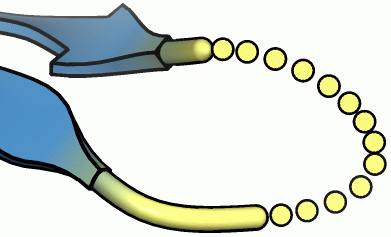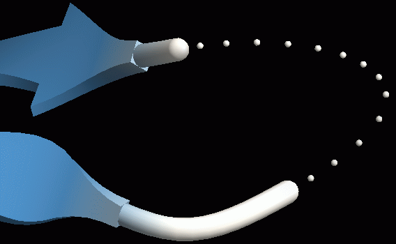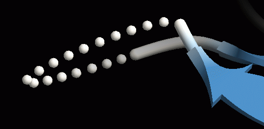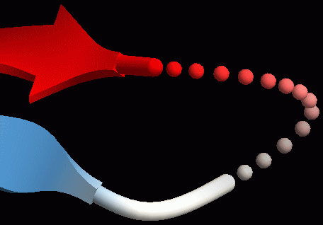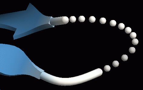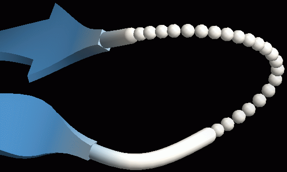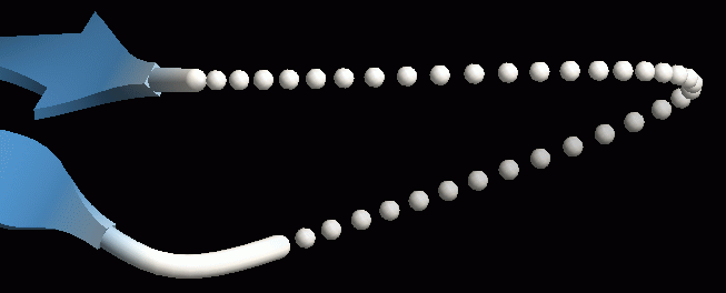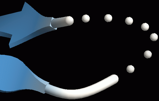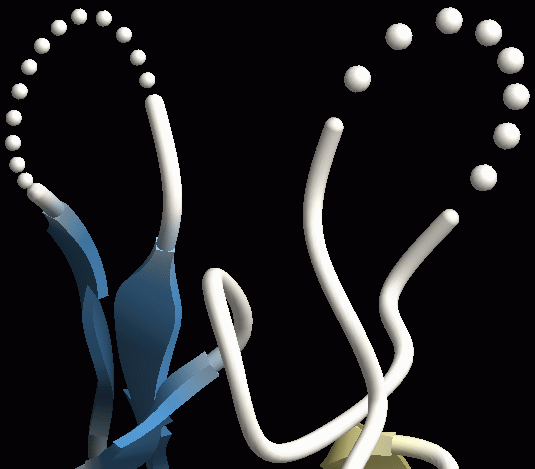Disordered領域の表示タンパク,核酸のdisorder領域の主鎖を表示するためのrendererです. 結晶構造でdisorderし見えていない部分を,Ribbon rendererなどの主鎖を滑らかに(Bezier曲線の)点線でつないだように表示できます. 作成Disorder rendererはRibbon renderer等の不連続部分を点線でつなぐものなので,それ単独では機能しません. まずはじめにRibbon(あるいはCartoon, Nuclなど)rendererを作成し, その次にDisorder rendererを作成してください. Disorder領域の判定同じchainに含まれているのに,残基番号が連続していない(Ribbonなどで主鎖表示が分断される)ような場合に,その間がdisorderしていると判定され,disorder rendererによる点線表示の対象となります. (前後でchainが違っていたりすると表示されない) 色の設定色の設定は,他のrendererと同様にColorパネルで行います. 色は,Disorder領域の両端の残基の色で着色されます. 両端で色が異なる場合は,両方の色の間でgradientになります. プロパティー設定Common tabSelectionDisorder rendererも,他の分子(MolCoord)用rendererと同様に,selectionを指定して表示部分を指定(制限)できます. Defaultではselectionは*になっており,分子中disorderしている領域全てが点線表示の対象となりますが, これをたとえば「A.1:100.*」に変更すると,chain Aの残基番号1から100の範囲内にあるdisorder領域のみが点線表示対象となります. この機能を使用して,1つの分子に複数のdisorder rendererをattachして,点線の形状を変えたりすることが可能です. 下図の例では右のdisorder領域と左のdisorder領域に対して別々のrendererを作成することで,ドットの大きさと間隔が異なるように表示しています. その他他のrenderer同様に,Edge linesによる輪郭線や,materialを変更してべた塗にするなどが可能です. 下図は,edge線を設定しmaterialをnolighting(べた塗)に設定した例です. Disorder tabTargetDisorder領域の点線を表示するtargetのrendererを指定します. 作成時には,自動的に,その時点で存在するribbon, cartoon, nucl等のrendererから適当に選ばれるようになっています. 意図していないtargetが選ばれてしまっている場合は,この設定を変更してください. Detail点線の点(球)のポリゴン分割レベル.大きいほど細かく滑らかになる. Dot size点線の点(球)の大きさ.Defaultは0.3. 下図左は0.1,右は0.5にした場合の例. Dot separation点線の間の間隔.下図左は0.6,右は1.8にした場合の例. Loop sizeDisorder部分と主鎖のつながり方を指定する.大きい値にするとよりなめらかに,飛び出した形になる.(具体的にはBezier曲線の制御点の位置に影響する) Default値は2.0. 下図左は1.0,右は6.0にした場合の例. Loop size 2Disorder部分とC末端側主鎖(タンパクの場合)のつながり方を指定する. Defaultでは値は-1になっているが,その場合N, C末端ともに(上記の)Loop sizeの値が使われる. 0以上の値を指定すると,Loop sizeがN末端,Loop size 2がC末端側の接続の滑らかさになる. 大きい値にするとよりなめらかに,飛び出した形になる. (具体的には,N末端,C末端側それぞれのBezier曲線の制御点の位置に影響する) 下図は,loop size = 0.5, loop size 2 = 4にした場合.loopsize(N末端側,手前のβシート側)は非常に小さいので,折れ曲がったように不連続になっているが,loopsize2(C末端側,奥のβシート側)は大きいので,滑らかに接続されている. |