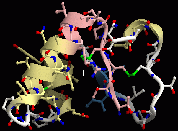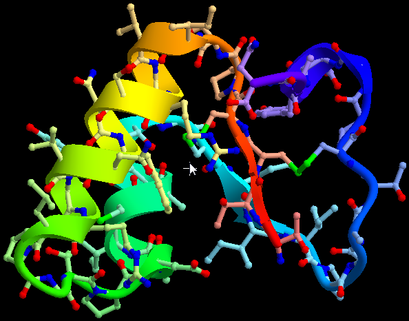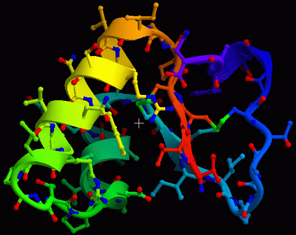 分子に対する着色着色という概念着色という概念は,チュートリアルDocuments/GUIのチュートリアル(CueMol2)/Step7でも説明されている通り,Rendererに対して適応することで,それに応じてRendererがObjectを着色して表示するというものでした. どういう場合に必要なのかしかし,Rendererではなく分子オブジェクト(MolCoord)ごとに色が決まっている場合が多く, 1つの分子に対して複数のrendererがある場合, それぞれが統一性が取れた色遣いになるようにするには, 各々のRendererに対して同色を一つ一つ設定してやる必要がありました. これでは面倒です. そこで,バージョン2.0.1.207では,新しく分子に対する着色,という機能を実装しました. 分子に対して大元となる着色を指定しておき, 随時Renderer側で「$molcol」という特殊キーワードを指定することで, 分子側の設定を参照できます. これで,必要に応じて分子で決まっている統一した着色を行うことができるわけです. 以下で実例を挙げて具体的な使い方を説明します. 具体例で解説以下では,crambin 1CRN.pdbを使用して具体的に説明します. サンプルファイルは, になります. Colorパレットで分子を選択従来,ColorパレットではDocuments/GUIのチュートリアル(CueMol2)/Step7にあるように rendererしか選択できませんでしたが,バージョン2.0.1.207以降では以下のように object (但し分子に限る)もリストに現れ,選択できるようになりました. 例えば,1CRN.pdbという分子を読み込んでribbon表示にした場合, 以上のように,「1CRN.pdb/ribbon1」以外に「1CRN.pdb」という項目も表示されるわけです. ここで,「1CRN.pdb」(分子object)を選択すると,分子に対する着色を編集できます. (デフォルトでは,Paint coloringで二次構造で色分けする状態になっています) 以下では,まずこのデフォルトの着色はデフォルトのまま置いておいて, 分子の色をどのようにしてrendererから参照するかを説明します. 分子の色をribbon rendererから参照まず,既にあるribbon rendererから分子色を参照するように変更します. 下図のように,Colorパレットで1CRN.pdb/ribbon1を選択し,右のプルダウンメニューからSolid coloringというのを選択します.すると,分子グラフィクスの方は白一色のribbon表示になります. そして次に,Default color項目の設定で,下図のように「Use mol color」という項目を選択します. $molcolという文字が入り,色は灰色になります(メニューを使わずに$molcolという文字を直接入れても同じ). GUIの部分の色は灰色になりますが,実際のribbon rendererの方の色は, 分子の着色が反映されて,二次構造ごとの着色になります. (ただ,元から二次構造ごとの着色になっていたため一見色に変化はないように見えますが...) 分子の色をballstick rendererから参照さらに,1CRN.pdbに対してさらにballstick rendererを作成します. デフォルトではCPK coloringになっているため,図のような表示になるでしょう. ここで,例えば炭素原子の色のみ,主鎖のリボン表示に合わせたいとします. 従来では,CPK coloringでは元素ごとにしか着色できなかった為, 炭素の色を変更すると,全部の炭素原子の色を変えることしかできませんでした. 以下のように,炭素の色の設定で「Use mol color」という項目を選択します. GUIの部分の色は灰色になりますが,グラフィクスのballstick rendererの炭素原子の色は, 下図のように主鎖のリボンと同じ色になります. 分子の着色を変更する次に,分子の着色を変更し,$molcolを使用しているrendererでの変化を見てみましょう. Colorパレットで,再び1CRN.pdbを選びます.そして,1〜10番の残基をピンク色に設定します.(具体的な方法はDocuments/GUIのチュートリアル(CueMol2)/Step8を参照) すると,分子グラフィクスの方は下図のように変化します. 残基番号1〜10番のribbon表示だけでなく,ballstick表示の炭素原子の色のみ変化していることが分かります. (ここまで操作した状態のqscファイルが,サンプルファイルmolcol_sample1.qscです) さらに例えば,分子の着色をrainbow coloringに変更すると,下図のようにribbonだけでなくballstickも 色が変化します. 論文の図とか以上の例からわかると思いますが,例えばよくある論文の図等だと,