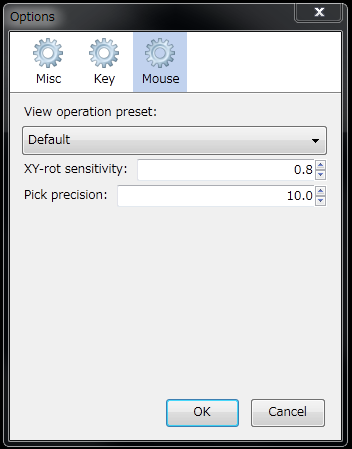 分子ビューにおけるマウス入力の設定CueMol2.0.1.X以降では,分子ビューにおけるマウス操作をカスタマイズすることが可能です. ただし,残念ながらMacOS X版では期待した通りに動くよう実装できていません. 今後修正していく予定です. メニュー「Edit」→「Options」を実行すると,