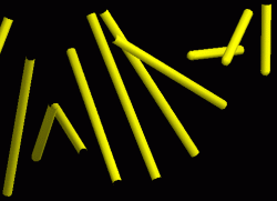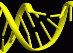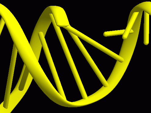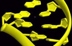 核酸用レンダラーnuclRNA, DNA等の核酸専用のレンダラーです.Tube rendererと同様の主鎖のチューブ状に表示に加え,塩基残基をスティック状などの様々な形状で表示できます. プロパティーによる設定Nucleic acidタブShow Tube主鎖チューブを表示するかどうかを指定します.チューブ表示をoffにし,他のtube rendererで主鎖を表示することで,より複雑な表示を行うこともできます.下図左はShow tubeをoffにした状態,右は他のtube rendererで2種類の異なる主鎖表示を組み合わせた例です. Connect base pair残基がbase pairを形成している場合,2つの残基を1本のstickで表示するか(on),2本の別々のstickで表示するか(off)を指定します.下図はoffにした場合です. Base type