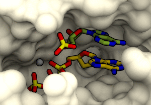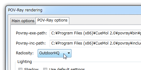 Radiosity法を使用した奥行き感のあるレンダリングRadiosity法は, 実世界の現象に近い光の挙動を模して,レイトレーシング法よりもよりリアルに物体表面の陰影を表現したレンダリングが可能になります. 右がRadiosity法,左がレイトレーシング法で作成した図です. このように,特に奥行き感が分かりやすくなりますが, しかし,その分計算量が多くなるため,レンダリングに時間がかかります. CueMolでは,POV-Ray rendering dialogで指定することで, Radiosity法によるレンダリングをおこなうことができます. Radiosity renderingのモード上記のdialogのRadiosityの項目にある設定のように,Radiosity renderingには以下のようなモードがあります.